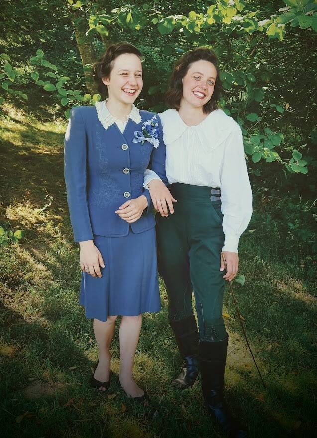 And here we have two 1940s outfits. Corrie is wearing our Great Grammy Marjory's jodhpurs, something she saved up her money and bought while she was working in DC so she could go on equestrian excursions around the city. (I have actually worn these for riding, and they are much more comfortable than jeans!)