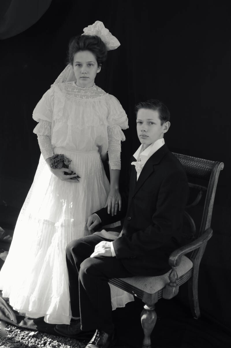Slipping tiny kid gloves over her hands is the last step. Anna and her sister tiptoe across the hall to the spare room, where dwells the only full length mirror in the house. After a few spins in front of the mirror, they run giggling back to their room, taking care that the guests who are starting to trickle in don't get a glimpse of the bride. Think that's a bit frivolous? Well, remember, Anna is only 16 years old!